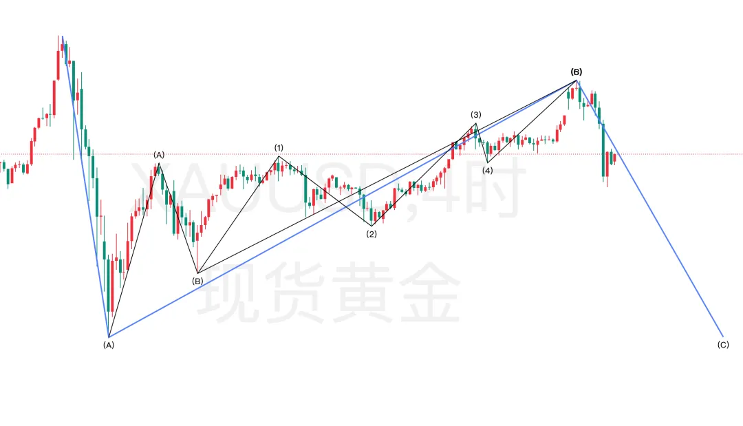 2、四小时级别:结构上,我们前期讲到,黄金自高点5597开始走调整,5597下跌4402为A浪,自4402的上涨为B浪。