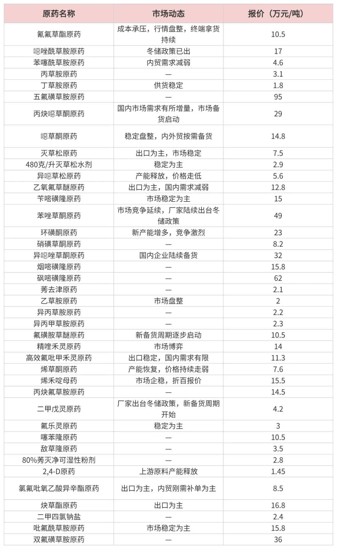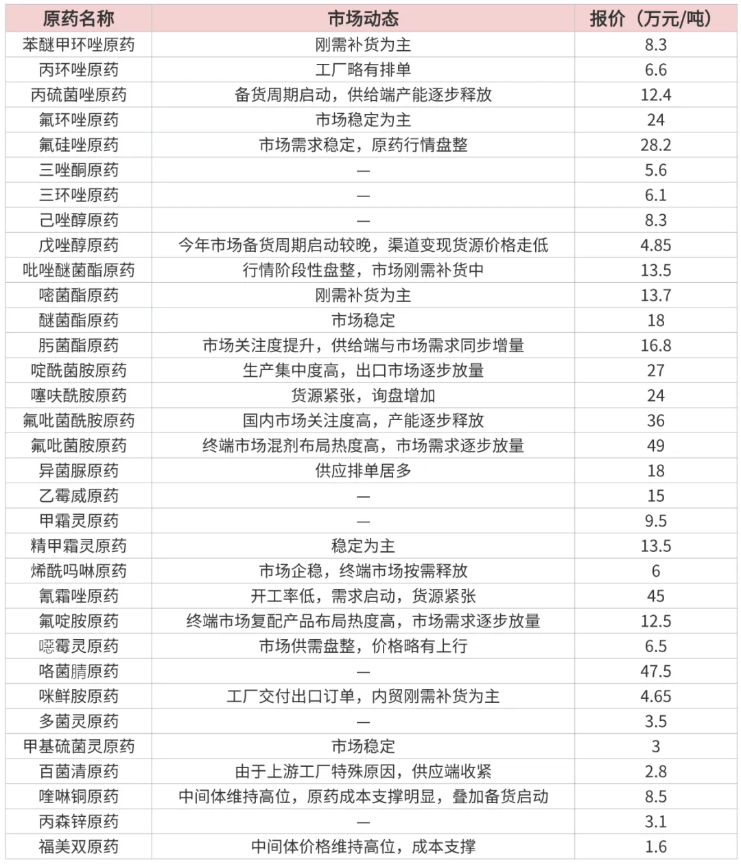 本周农药原药市场在春耕备货需求支撑下保持平稳上行趋势,部分热门品种表现较为活跃。随着春耕工作的持续推进,下游采购需求仍将进一步释放,加之供应端监管力度加大、成本面支撑增强,预计短期内市场将延续回暖走势。以色列与伊朗冲突升级,建议产业链上下游企业密切留意原油、溴素、甲醇、尿素等化工原料的价格变化,及时关注市场供需变动、政策调整及价格走势,合理安排备货与生产节奏,有效防范市场波动风险,灵活应对行情调整带来的机遇与挑战。