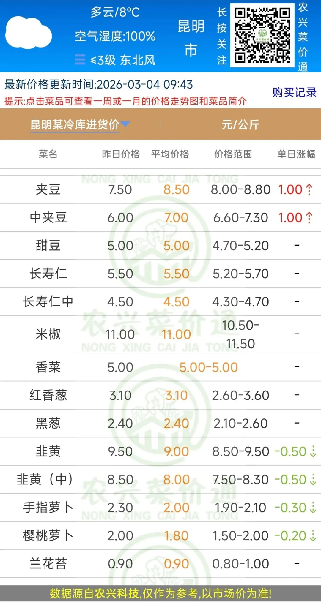 昆明某冷库进货价格列表
