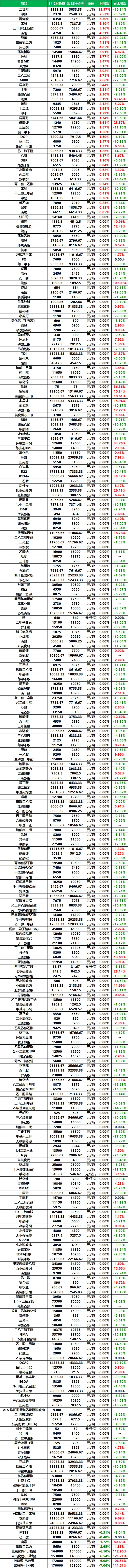 2026年3月3日大宗商品价格涨跌榜中化工板块环比上升的商品共44种,其中涨幅5%以上的商品共5种,占该板块被监测商品数的1.5%;涨幅前3的商品分别为二甘醇(12.97%)、甲醇(7.52%)、丙烯酸(6.30%)。