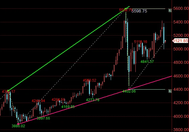 昨日黄金早盘开于5324,直线拉升触及5380高位后快速回落,跌破前日射击之星低点5260后加速下行,最低下探4996,尾盘探底回升,收于5088;日线收出下影线长于上影线的大阴柱,形态显示空头放量但低位买盘承接强劲,短期进入宽幅震荡修复。