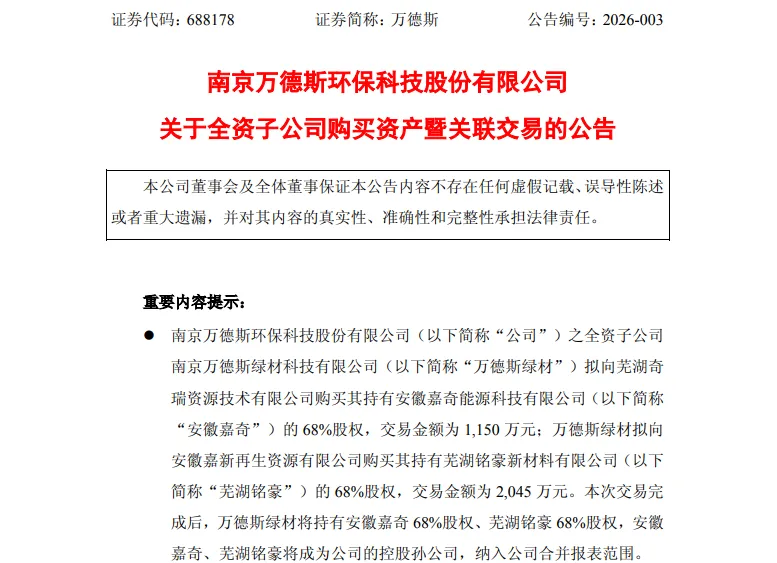 3月2日,万德斯发布公告称,公司全资子公司南京万德斯绿材科技有限公司拟向芜湖奇瑞资源技术有限公司购买其持有的安徽嘉奇能源科技有限公司(下称“安徽嘉奇”)68%股权,交易金额1150万元;拟向安徽嘉新再生资源有限公司购买其持有的芜湖铭豪新材料有限公司(以下简称“芜湖铭豪”)68%股权,交易金额2045万元。本次交易完成后,安徽嘉奇、芜湖铭豪将成为公司控股孙公司,纳入公司合并报表范围。