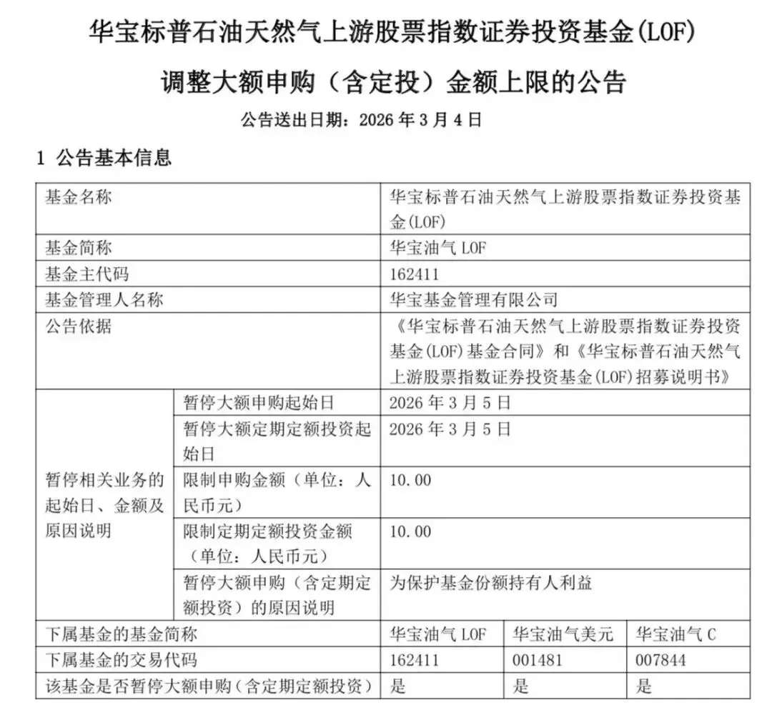 今天油气 LOF(华宝油气、嘉实原油、石油基金等)剧烈波动、集体停牌至10:30才复牌,叠加外汇额度耗尽、申购又开始限购了,华宝油气拔网线了,明日起限购10元,全球油气能源从限额10000变成限额500,真是话题满满!