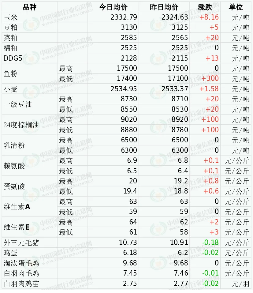 3日DDGS价格局部偏强。近期玉米价格强势上涨,酒精企业生产压力仍存,支撑酒精企业挺价心态,市场走货情况尚可,下游企业以刚需采购为主。预判3月份期间产区DDGS交易价格总体稳中略显偏强走势为主的可能性更大,月度均价环比止跌转上涨的几率在逐步提高。自中东冲突后市场重新关注中国是否会额外购买800万吨美国大豆,CBOT大豆基准期约收低0.8%。中东战事对国内进口大豆供应影响不大,巴西大豆收割及发运节奏是影响国内进口大豆供应和定价的关键。美豆维持高位运行,成本端对粕价仍有抗跌支撑。但国内油厂开工率快速攀升,豆粕库存增加,下游企业库存充足,采购积极性不高,现货承压连续回落,近期或维持震荡调整走势。今日棉粕市场价格波动有限。国内油厂开工率快速攀升,豆粕库存增加,下游企业库存充足,采购积极性不高,现货承压连续回落,利空棉粕。而棉粕产出恢复慢,供应端压力不大。需求端,对棉粕需求保持平稳,无明显增量。预计棉粕价格震荡调整。今日郑州菜粕期货高开后震荡上涨。加拿大油菜籽期货收盘上涨,基准期约收高1.6%,主要原因是美国和以色列对伊朗持续的袭击推高了原油价格。菜粕现货小幅上涨,水产需求恢复较慢,叠加供应预期改善限制菜粕涨幅空间,将继续窄幅震荡调整。外盘方面,秘鲁鱼粉厂商对厄尔尼诺影响的担忧,心态坚挺,其中秘鲁新季超级蒸汽鱼粉预售参考价格为CNF2350美元/吨。国内进口鱼粉市场,鱼粉到货少,部分持货商停报价格,当前秘鲁超级蒸汽鱼粉价格集中在17400-17500元,张300元,短期鱼粉偏强走势继续。今日小麦市场价格稳中偏强小幅调整。节后面粉企业复工节奏偏慢、开机率不高,终端消费疲软,企业补库意愿不强。但随着学校陆续开学,有望带动面粉消费回暖,加上近期雨雪天气影响短途运输,部分地区小麦上量偏慢,加剧局部阶段性供应偏紧。昨日CBOT豆油市场跳空上涨,受到强势原油的提振。昨日马来西亚棕榈油市场大幅攀升,跟随美国豆油和能源价格涨势。国内油脂期货市场承接原油强势整体上涨,棕榈油期货价格重心连续回升,看空预期得到明显改善,夜盘继续扩大涨幅。中东战事提振原油强势大涨,植物油的生柴需求预期明显增强,原油上涨的外溢效应推动油脂市场强势回升。国内油脂因库存充足和处于消费淡季,呈现跟涨状态,预计近期国内油脂价格或延续稳中偏强。中美贸易冲突缓和,互相取消额外的商船岗务费,国内港口乳清粉到货量趋于好转,大猪仔猪价格低迷,乳清粉市场报价稳中偏弱整理,后续需注意关税谈判进展以及港口库存量等因素。2025年12月,我国赖氨酸与赖氨酸盐及酯的出口量为9.8万吨,同比增0.4%,环比增8.4%。11月万里润达氨基酸生产线计划阶段性升级检修。2月25日起星湖伊品计划对赖氨酸、苏氨酸及小品种氨基酸上调50-300元/吨。3月2日金玉锋98%赖氨酸报价6.6元/公斤,70%赖氨酸报价4.6元/公斤。2025年12月国内蛋氨酸进口量为2.1万吨,同比增10.6%,环比增66%.市场称希杰马来西亚蛋氨酸工厂12月至2026年1月初检修,新和成固蛋工厂部分生产线计划1月中下旬开始停产检修2-3周。12月31日市场称新和成固蛋提价至18.5元/公斤。1月8日市场称宁夏紫光蛋氨酸价格上调7%。1月30日市场称安迪苏液蛋提价10%。2月3日起新和成固蛋出口报价提升8%。2月27日市场称安迪苏液蛋计划提价1元/公斤。欧洲VA1000市场报价15-16欧元/公斤。10月28日市场称部分厂家报价提至70-72元/公斤。2026年1月6日新和成VA提价至70元/公斤。2026年1月15日市场称浙江医药VA提价至75元/公斤。欧洲VE市场报价5.5-5.8欧元/公斤。1月13日市场称浙江医药VE产品提价至72元/公斤。1月22日市场称浙江医药昌海生物分公司计划自2月初起停产约4周。2月5日市场称新和成VE产品出口报价上调15%。市场偏强运行。全国均价为 10.73元/公斤,较昨日价格下跌1.42%。当前供应端偏宽松,前期压栏大猪、规模场出栏增加叠加冻品库存偏高,市场供给充足;需求端处于节后淡季,消费偏弱、屠企开工不高,持续压价收购,养殖端亏损扩大。预计近期仍低位震荡。今日鸡蛋价格稳中偏弱。鸡蛋整体货源充足,需求端处于节后淡季,终端消费疲软,走货一般。饲料成本相对稳定,养殖多处于保本或微利状态,市场情绪分歧较大。预计近期鸡蛋价格或将窄幅震荡。今日主产区山东鸡蛋均价6.11元/公斤,与昨日价格持平;河北鸡蛋均价5.87元/公斤,较昨日价格下跌0.03;广东鸡蛋均价6.27元/公斤,较昨日价格下跌0.20;北京鸡蛋均价6.32元/公斤,与昨日价格持平。全国淘汰蛋毛鸡均价稳定。淘汰鸡货源偏紧,屠宰开工逐步恢复、开学团餐带动走货,支撑价格,预计近短期淘鸡价格或将震荡偏强,若出现集中出栏或采购放缓,价格存在小幅回调可能。今日山东地区淘汰蛋毛鸡均价10.20元/公斤,与昨日价格持平;江苏地区淘汰蛋毛鸡均价10.40元/公斤,与昨日价格持平;辽宁地区淘汰蛋毛鸡均价9.80元/公斤,与昨日价格持平。白羽肉毛鸡价格整体稳定。养殖端出栏集中、供应宽松,屠宰企业复工但收购谨慎、压价明显,终端消费疲软、走货不畅,叠加饲料成本高位、养殖利润微薄,预计近期白羽肉鸡价格或仍将偏弱震荡。今日主产区山东白羽肉毛鸡均价7.07元/公斤,与昨日价格持平;辽宁均价7.59元/公斤,较昨日价格下跌0.04;主销区江苏均价8.48元/公斤,与昨日价格持平。今日白羽肉鸡苗价格稳中偏弱