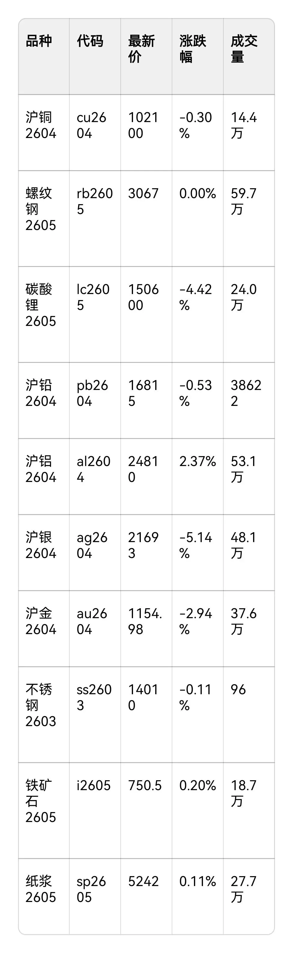 - 沪铜、沪铅小幅下跌(-0.30%、-0.53%),不锈钢微跌(-0.11%),整体偏弱震荡。