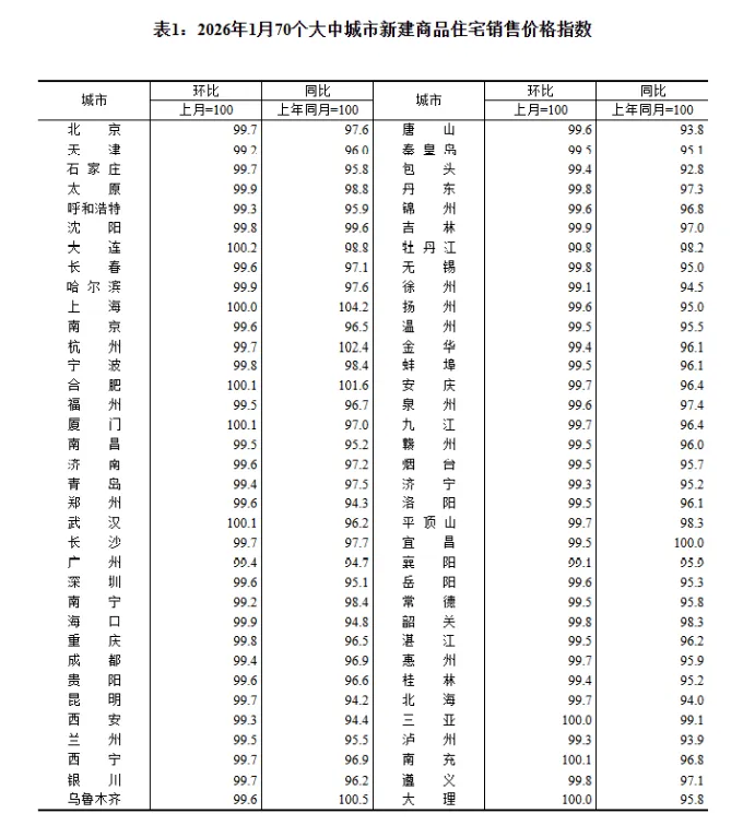 此外,2月13日,国家统计局公布的2026年1月商品住宅销售价格变动情况显示,一二三线城市房价环比降幅总体收窄,止跌回稳的信号愈发清晰 。
