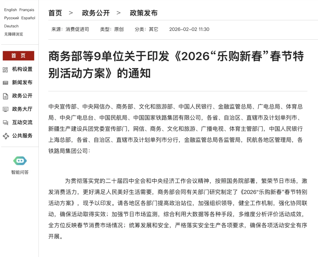 在春节假期期间(2月15日至23日),国家层面促消费政策持续加力。商务部等九部门印发的《2026“乐购新春”春节特别活动方案》正式落地,在“住”的方面明确提出联动家居卖场、家电品牌、家装企业推出 “新春焕新家”惠民促销。政策重点鼓励各地增加春节期间消费品以旧换新补贴数量,并明确加大对线下实体零售的支持力度。