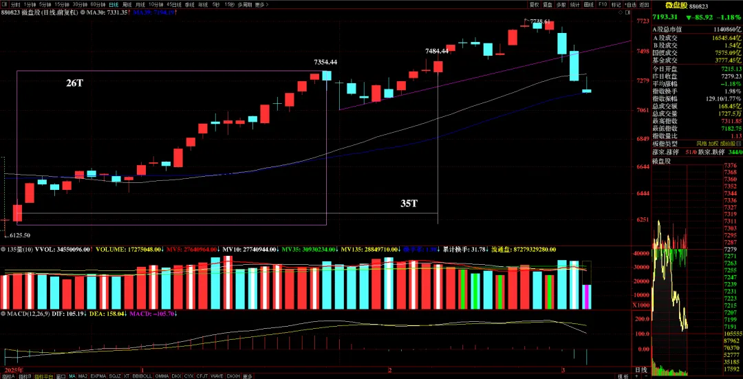 第七、个股涨少跌多。涨跌家数显示,369只上涨开盘,冲高到3448只上涨,收盘上涨1331只,跌跌4069只,涨停只有23只,跌停21只。昨天收盘“阴极”,两市融资余额减少224.78亿元,反弹符合历史走势规律,但冲高后部分资金“理所当然”低卖出了。狂欢之后往往是寂静。A股的规律就是短期大涨与大跌相生相伴。板块指数跌幅榜上,供气供热大跌5.08%居首,运输服务大跌4.06%,交通设施、煤炭均跌超2%。前两天大涨个股今天大多位列跌幅榜前列,115只跌超6%有多数属于油气、运输、化工板块。第一、微盘股指数能否在MA39附近止跌,最好能收于MA39上方。第三、三大指数的技术指标信号与66个交易日前类似,期待“寻底”成功。涨停家数的历史数据前低是去年4月7日25只,当天暴跌,目前只有23只,已经是极度“阴极”,预计下午会有增多。