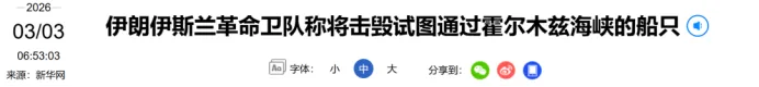 2月28日,美国和以色列对伊朗发动军事打击,伊朗伊斯兰革命卫队当晚宣布,禁止任何船只通过霍尔木兹海峡。据伊朗迈赫尔通讯社3月1日报道,一艘未经授权的油轮试图通过霍尔木兹海峡时被击中。