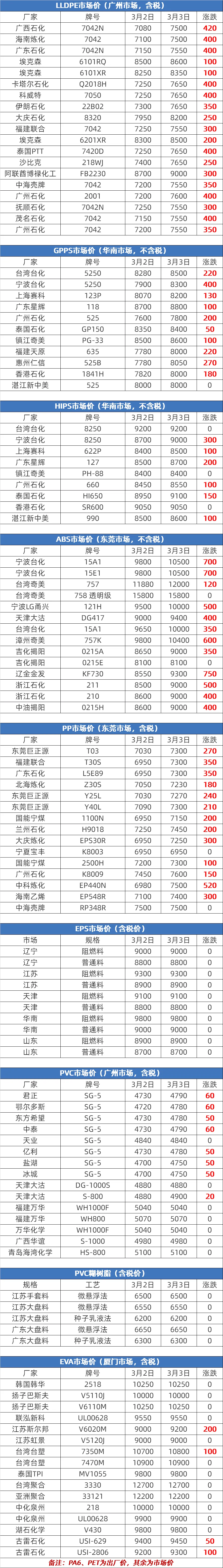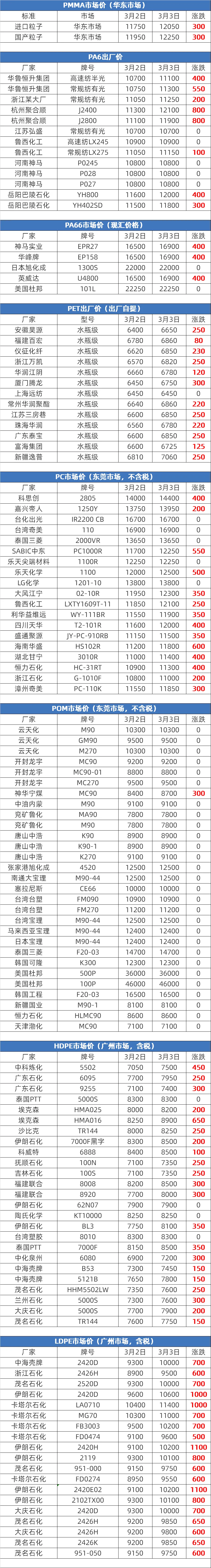 2026年3月3日大宗商品价格涨跌榜中橡塑板块环比上升的商品共14种,其中涨幅5%以上的商品共7种,占该板块被监测商品数的38.9%;涨幅前3的商品分别为PA6(8.59%)、ABS(6.50%)、LDPE(5.98%)。