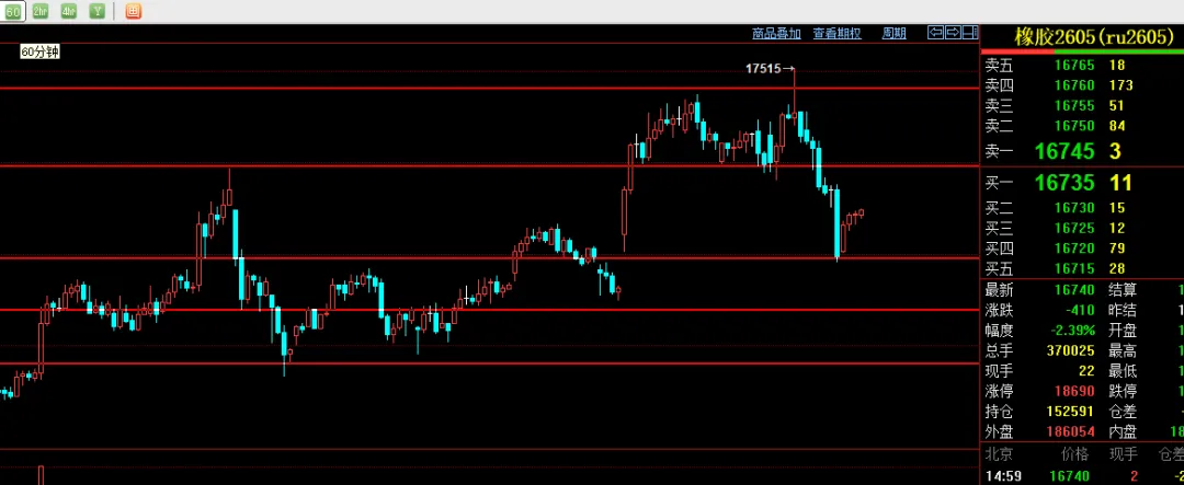 目前铁矿整体低位震荡看待。支撑750关口企稳到下方735低点不跌破企稳建议试试多单的反弹上方压力760突破则也继续看多为主,建议暂时低多。2604合成橡胶小时线;目前区间震荡偏多看待。