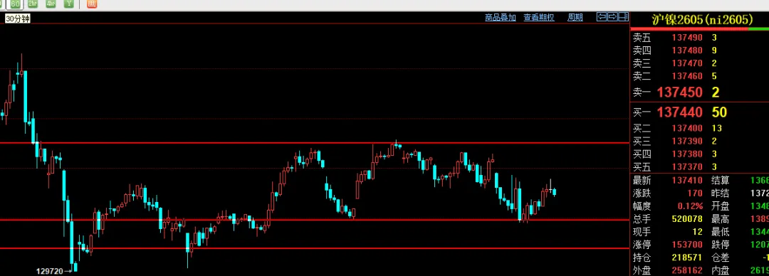 橡胶今天回落暂时还是区间震荡看待,上方关注压力17000整数关口突破则继续看多。下方支撑16500不跌破还是建议回调企稳多单思路,整体建议区间内低多为主。2605沪镍小时线;目前箱体震荡偏多看待。