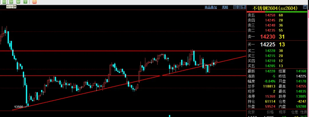 目前合成橡胶站稳12500还是偏多看待暂时可以看作多空分界线,等下方的回调13350到13500附近企稳也可以继续尝试反弹,激进的13700附近也可以继续参与多单。目前建议不跌破13200继续回调低多为主,2604不锈钢小时线;短线来看目前偏多看待。