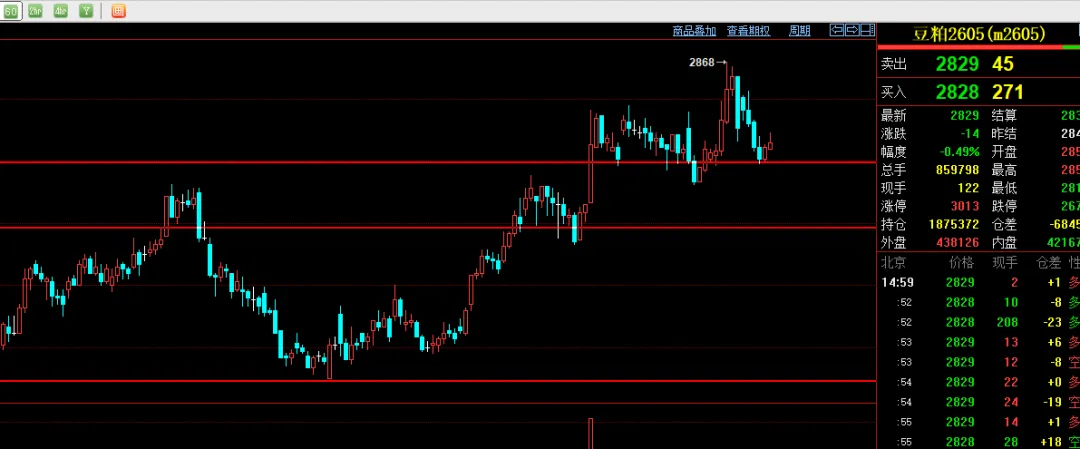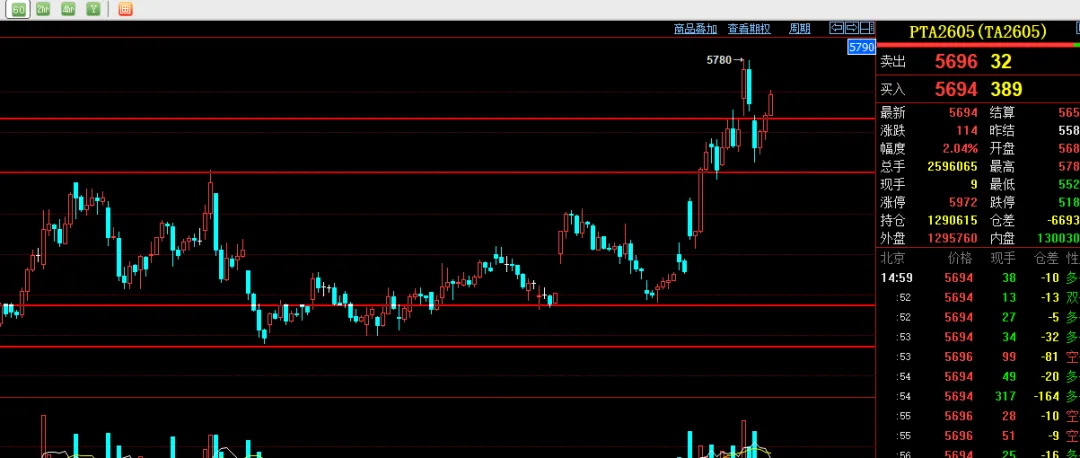 目前豆粕2750暂时可以看多空分界线,下方支撑2800到2780附近关注支撑企稳试试多单整体震荡偏多。激进的回到2820附近企稳也可以参与多单,上方压力2850突破则继续看多。2605PTA小时线;短线来看目前震荡偏多看待。