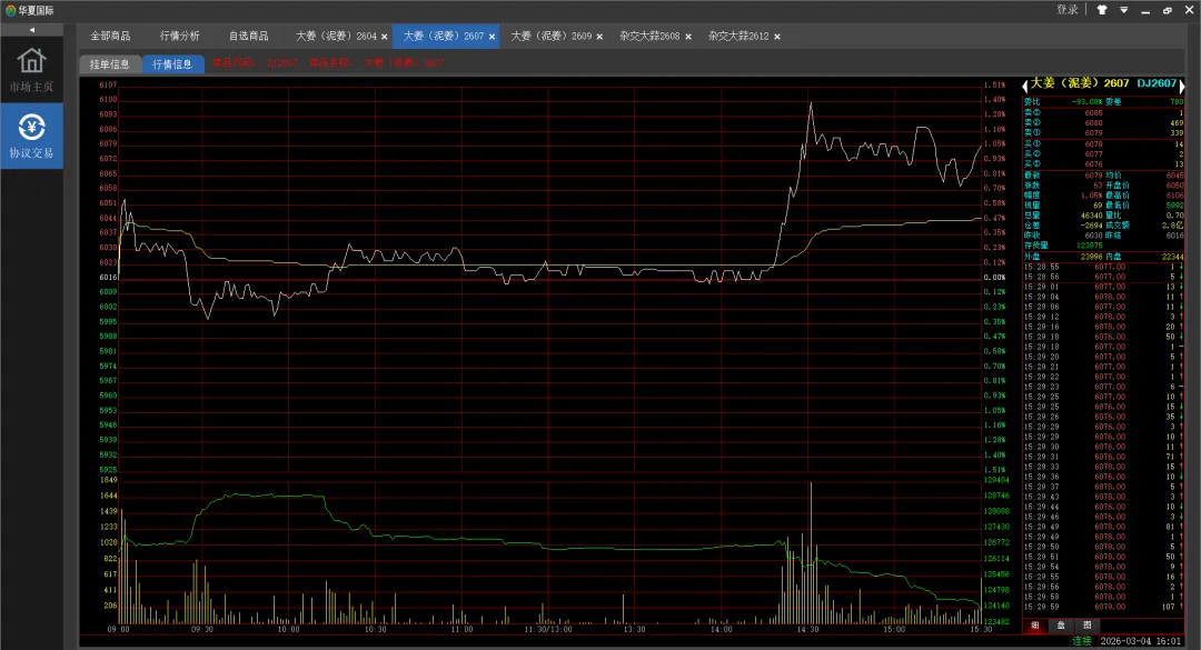 2607大姜(泥姜)合约库存量123975吨。成交46340吨,成交金额2.8亿,成交均价6045元,开盘价6050元,收盘价6079元,最低价5992元,最高价6106元,库存量同比上一交易日减少2694吨。