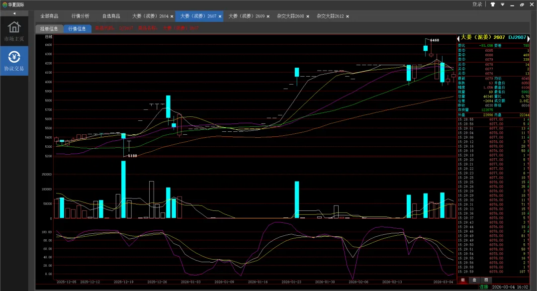 大姜2507合约今日盘面略微高开在6050价格,紧接着盘面回调均线下方后,在多方的增仓下,盘面回弹至6054价格,但随着多方获利减仓,盘面再次回调均线下方后,在双方的争夺下,盘面在6030价格附近形成短暂震荡,随后多方略微减仓,空方顺势增仓下拉盘面至今日低点5992价格,多方回补略微回拉盘面后,在双方的争夺下,盘面在6010价格附近形成震荡,之后随着空方的减仓,盘面回弹至均线上方后,双方回补减仓后争夺,盘面在均线上方形成震荡。临近午盘,空方增仓下拉盘面,多方随之减仓,盘面回调均线下方后,在双方持续减仓下,盘面在均线下方形成震荡直至收盘,午盘收在6020价格。