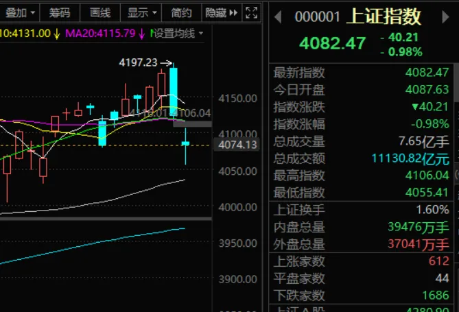从上证的K线看,今天是跳空低开,现在的股价就回到了4000-4100这个区间,上下各有一个缺口,我认为去向下摸4000点缺口的可能性不大,在目前这个位置横盘,等事态缓和再向上去修复的可能性更大。