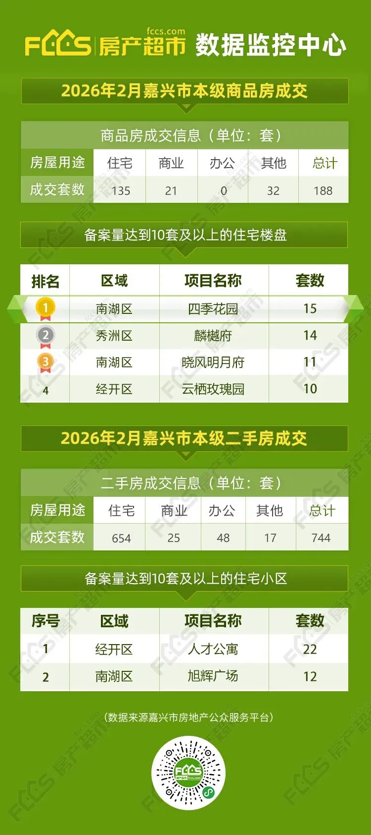 从备案排行榜来看,2月备案量达到10套及以上的住宅楼盘仅有4个,较去年同期的8个明显缩减。南湖区的四季花园以15套位居榜首,秀洲区的麟樾府以14套紧随其后,南湖区的晓风明月府和经开区的云栖玫瑰园分别以11套和10套位列三、四位。