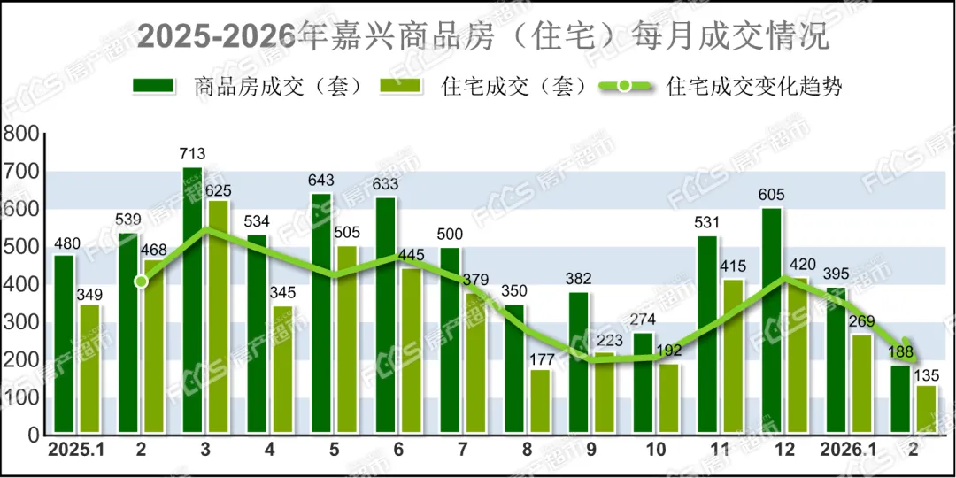 官方数据显示,2026年2月嘉兴市本级成交各类商品房共188套,其中住宅成交135套,估算日均成交套数仅个位数,环比1月(269套)下跌约49.81%,同比去年2月(468套)下跌约71.15%。
