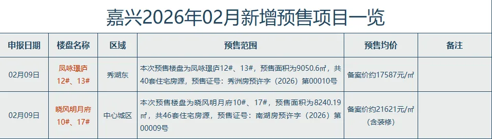 2026年2月,嘉兴市本级共新增2张住宅预售,预售住宅房源共86套,预售建筑面积17290.79㎡。