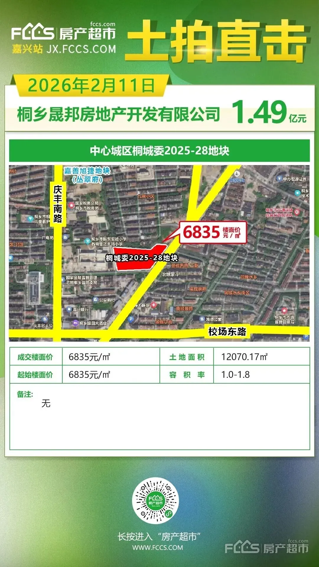 2月11日,大嘉兴2026年首场土拍正式启幕,最终桐城委2025-28地块由桐乡晟邦房地产开发有限公司以约1.49亿元底价拿下,成交楼面价约6835元/㎡。【详情】