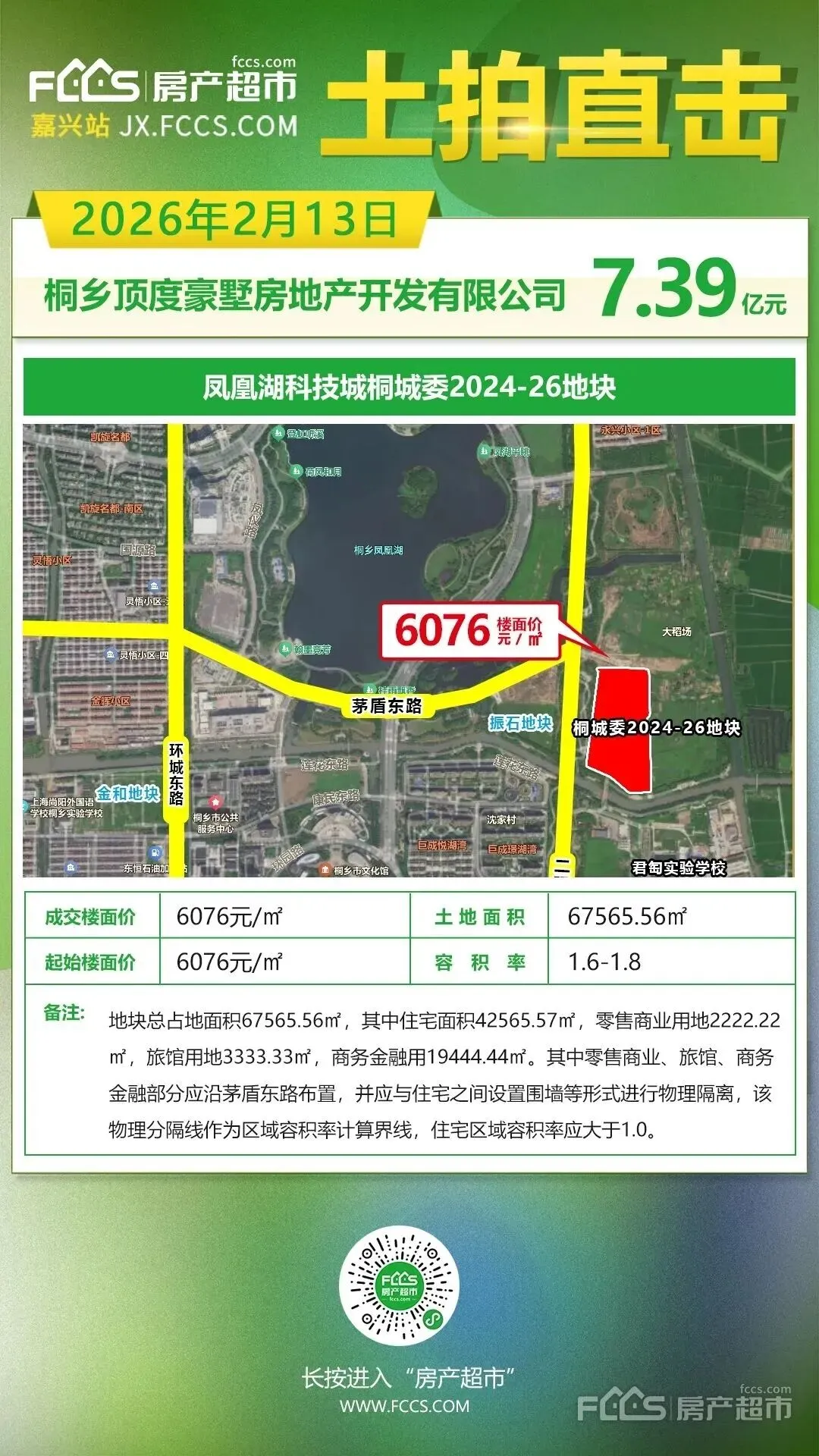 2月13日,桐乡凤凰湖科技城板块——桐城委2024-26地块成功出让,最终由桐乡顶度豪墅房地产开发有限公司以底价7.39亿元成功竞得,综合楼面价约6076元/㎡。【详情】