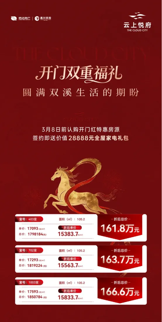 3月8日前,认购云上悦府开门红特惠房源,签约即送价值28888元全屋家电礼包(具体活动规则详询售楼处)。【详情】