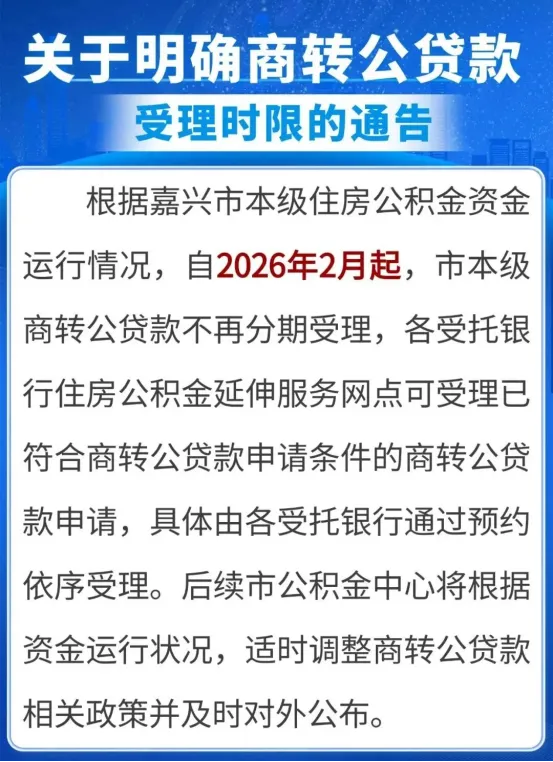 2、自2026年2月起,嘉兴市本级商转公贷款不再分期受理