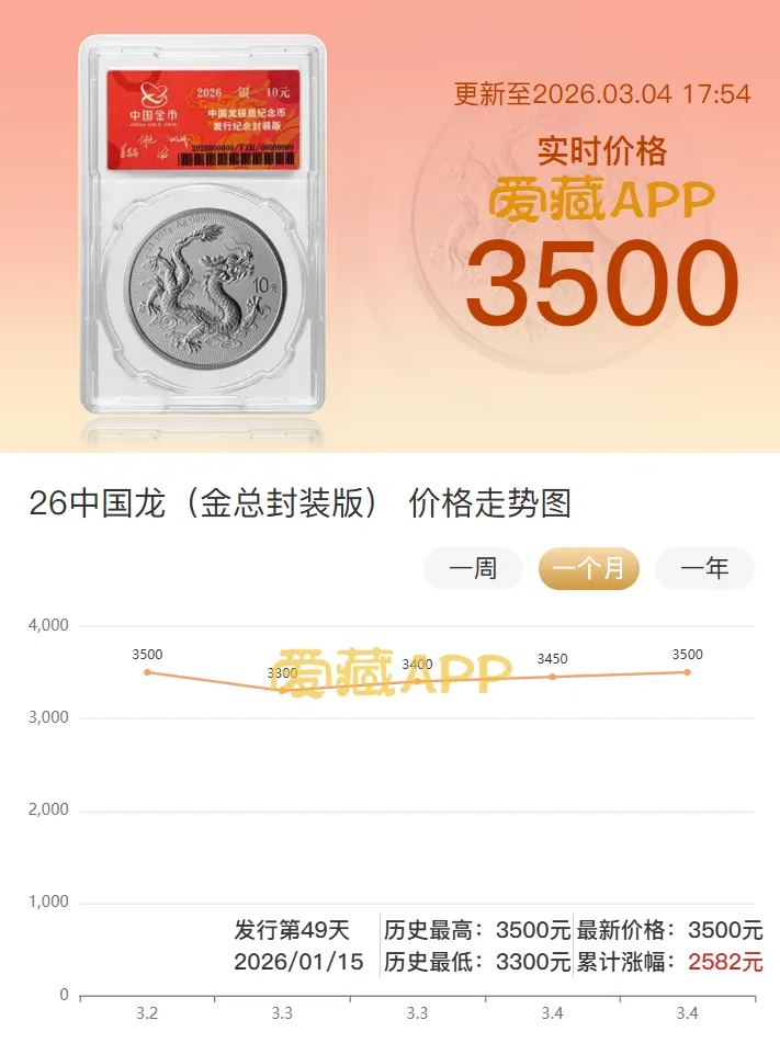3月4日爱藏APP快讯,2026版中国龙银币封装版市场热度持续火爆,普通期货(闷包)价格已涨至3500/枚,更是频频出现单笔成交10枚、5枚等期货订单。同时,留意到无47、无347等靓号的求购及出售贴逐渐浮现。(点击下图查看中国龙银币最新行情)