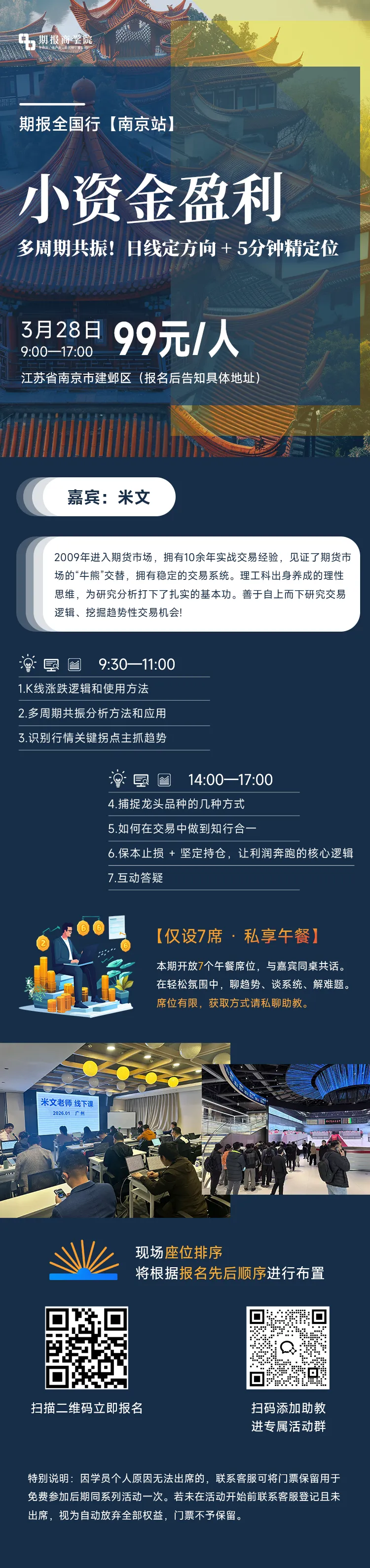 2026年2月已经结束,这一个月我们经历了节后的震荡,也见证了沪锡的强势崛起。今天我想结合我自己的交易案例,和大家深入聊聊趋势交易中最核心的开仓逻辑与止损原则,以及如何通过执行规则捕捉到那些真正的大行情。【扫码观看3月5日(周四)的米文老师直播,添加客服进免费交流群。】我的交易系统始终是纯技术的顺势交易,但“顺势”不等于追高杀跌。真正的顺势,是在上涨趋势中等待回调结束,在下跌趋势中等待反弹衰竭,然后才动手。很多人问:为什么要等回调?直接追进去不是更爽吗?答案是:回调结束的位置,才是多空力量再次确认的位置,止损小、概率高;而追突破往往是止损大、易被扫。就像我们开车,直道加速没问题,但弯道必须减速,等过了弯道确认方向再加速,才是最安全的。节后棉花一根大阳线突破震荡区间,日线方向明确转多。接下来就是等待回调。小时图很快给出了答案——价格回踩均线企稳,出现“回调结束”的经典信号。此时,我们切换到5分钟图寻找精确入场点:价格小幅回踩后再次拉起,突破近期小高点,开仓做多,止损设在最近的低点下方。这笔交易止损很小(仅10来个点),盈亏比很快达到3倍以上,我们迅速将止损移至成本价保本。随后价格继续上涨,最高浮盈近2万,但后续出现长上影阴线,小时图有压力迹象。由于已设保本,我们坦然接受利润回吐,最终保本出局。虽然没赚到钱,但也没亏,更重要的是,我们完全按照规则操作,心态平稳。周四我尝试了苹果和豆油。苹果日线有信号,但小时图共振不足,属于“勉强开仓”,最终止损小亏。豆油则是在5分钟回调结束时入场,止损很小,但价格随即反转打掉止损。这两笔都是正常止损,是系统必然的成本。我从不懊恼,因为我知道:只要止损小,亏得就有限;只要坚持规则,总会等到属于我的大行情。区分“正常止损”和“乱做亏钱”至关重要:前者是计划内的,后者是失控的。2月最后一个周五,沪锡成为主角。为什么选它?很简单:对比。在有色板块中,铜、铝、锌都还在震荡或弱势,唯独沪锡日线已经走出高低点上移的强势结构,均线多头排列。做多就要选最强的龙头,这是铁律。日线确认强势后,我们等待小时图的回调结束。小时图果然出现经典的回踩企稳信号,但当时5分钟均线不太配合,我犹豫了,错过了第一入场点。随后价格继续拉升,但此时绝对不能追——因为止损太大。我耐心等待5分钟再次出现回调结束结构,终于在价格突破小平台时开仓,止损放在平台低点下方。开仓后,价格一度濒临止损,但始终未破。设好止损后我安心睡觉,第二天醒来,浮盈已超8万,周五晚更是突破10万。这笔交易完美诠释了“截断亏损,让利润奔跑”——如果一开始止损被打,也只是小亏;但既然市场选择继续上涨,我们就让利润尽情奔跑。目前市场多数品种仍在震荡,比如黑色系、豆粕等。此时最考验耐心。但震荡中已出现一些值得关注的信号:比如碳酸锂,日线有企稳迹象,小时图若能与日线共振,可能出现机会。但要注意,该品种需5手起开,资金较小的朋友可以放弃,或者用“开5手减4手”的方式轻仓参与。另外,橡胶、棉花等仍在上涨趋势的回调中,需要再等几天,等小时图均线再次共振才能动手。记住:千万不要抢跑,日线没有信号,小时和5分钟再动也不做。很多朋友问我:怎么能拿住单子?怎么能不怕止损?我的回答是:靠一次真正的大赚建立信仰。就像这次沪锡,一手盈利数万,盈亏比超过10倍。当你亲身经历过这样一次“小止损换来大利润”,你就会相信这套系统,相信规则。我们的资金曲线,平时应该是小亏小赚的横盘,偶尔来一波陡峭拉升。你永远不知道下一波大行情何时来,唯一能做的,就是每次信号出现都去试,错了小亏,对了拿住。只要大亏被完全杜绝,长期下来,账户必然向上。这个市场,95%的人在亏钱,而在我们的圈子里,有50%甚至60%的人在赚钱。为什么?因为大家学会了用规则代替感觉,用系统约束人性。愿我们都能在趋势的浪潮中,做那个耐心等待、果断扣扳机的猎人。共勉。【扫码参与3月28日的米文老师南京线下活动,添加客服咨询。】