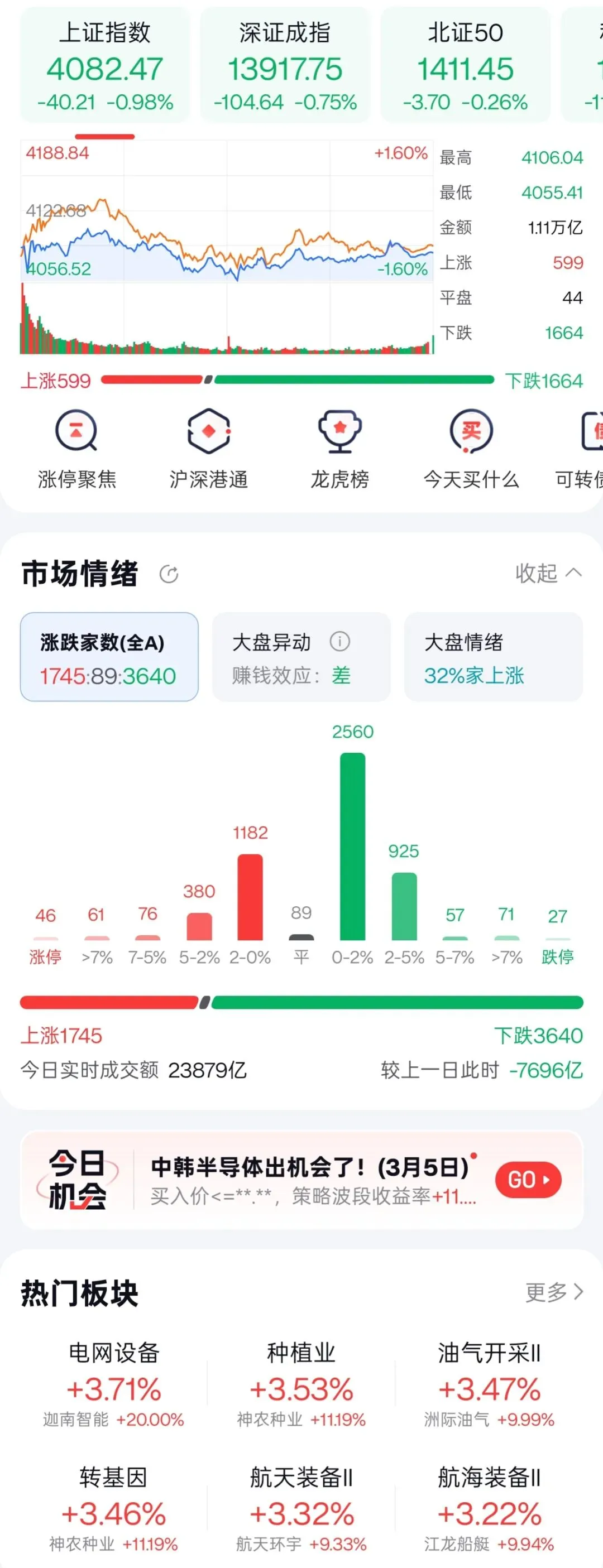 全市3640只个股下跌,赚钱效应差