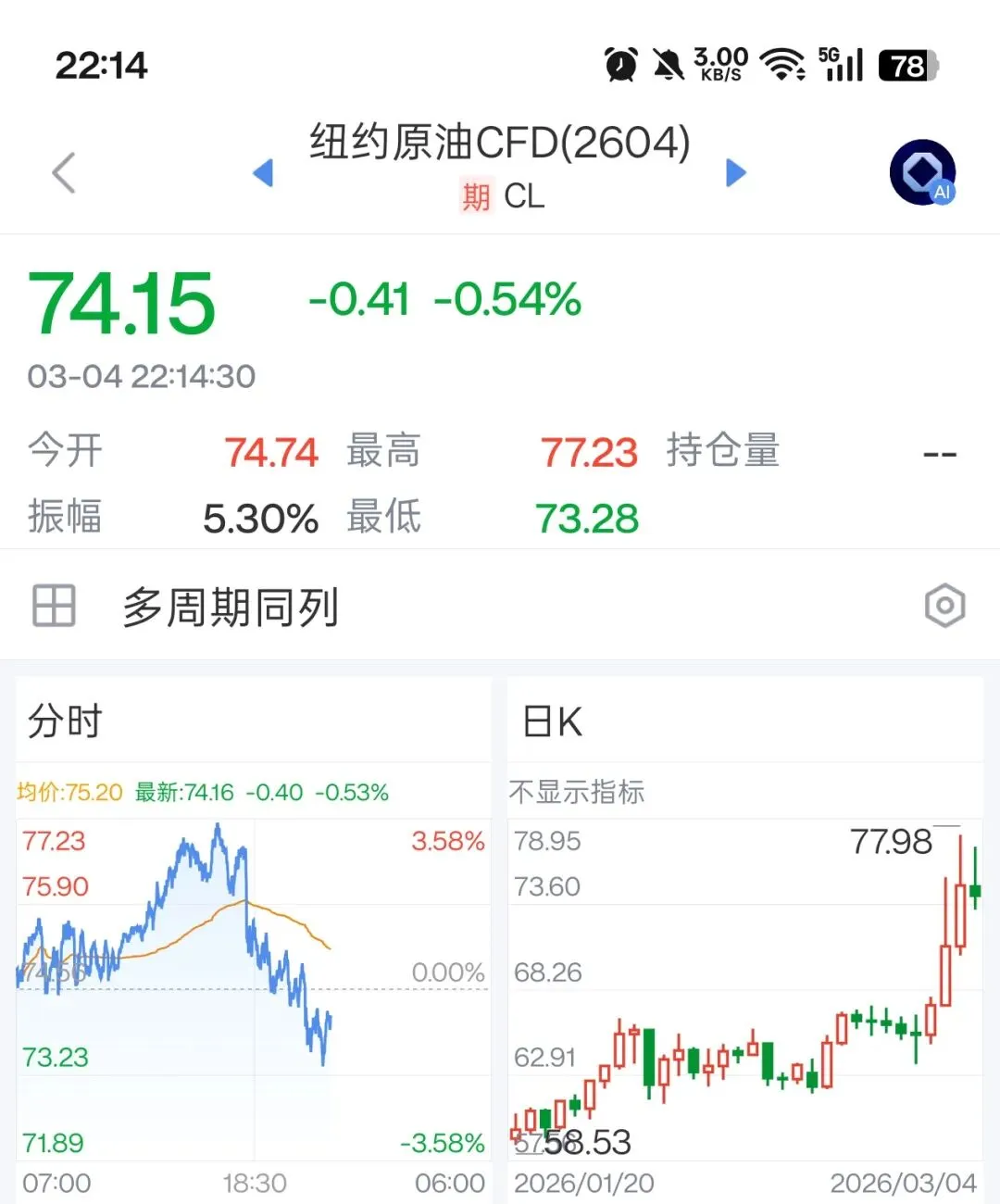 纽约原油今天由涨转跌报74.15美元一桶