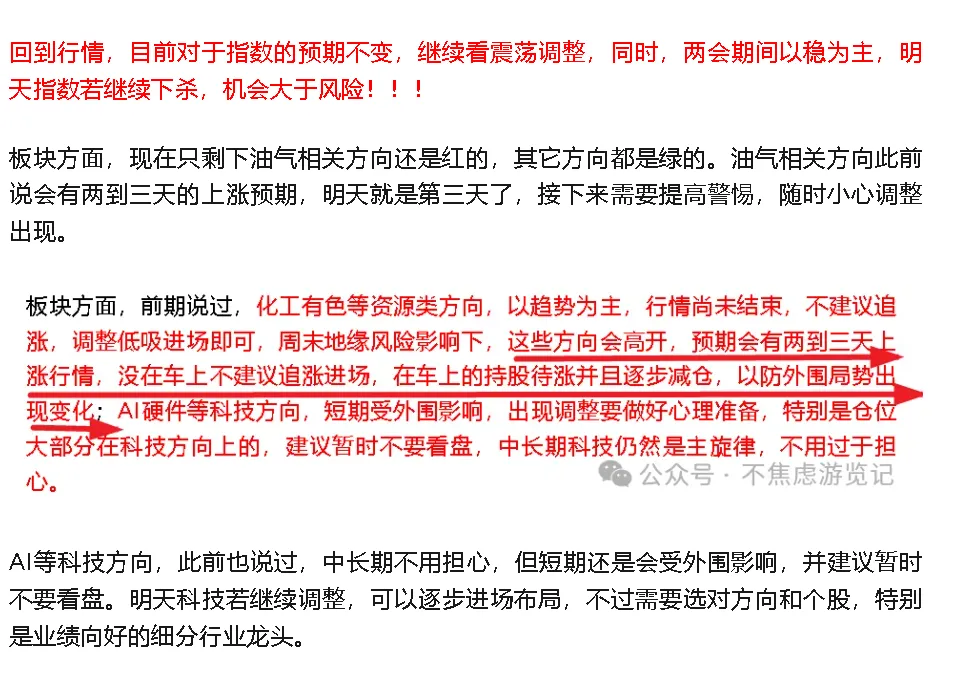 市场永远是对的,错误的是你的预期和策略,不要与市场争辩,而要与自己和解!!!今天指数低开低走,全天在水下震荡,盘中虽然有资金回流,但还是被压下去了,尾盘缩量收跌,成交大幅缩量,量能再次回到了2万亿上方。今天市场再次三千多家下跌,情绪依然处于冰点。从今天的行情来看,指数目前继续往下的调整空间不大了,下方有60日线和120日线支撑,叠加市场经过连续两天的放量,今天出现了大幅缩量,也意味着想跑的资金都跑得差不多了,剩下大多是躺平的了,所以,明天指数若继续往下调整,依然是机会大于风险,同时指数若小幅高开也不要急于追涨进场,后续还会有回调确认底部的过程,还会有进场机会。板块方面,油气今天大分歧,大部分的个股都是绿的,资金轮动到了农业及其它方向。油气方向,除了前排核心个股后续还会有上涨空间外,后排的个股大部分都会淘汰掉,进场要选好个股。农业方向要信早信,市场资金轮动会比较快。AI等科技方向,策略不变一、业绩预增:半导体材料、航天军工亮眼