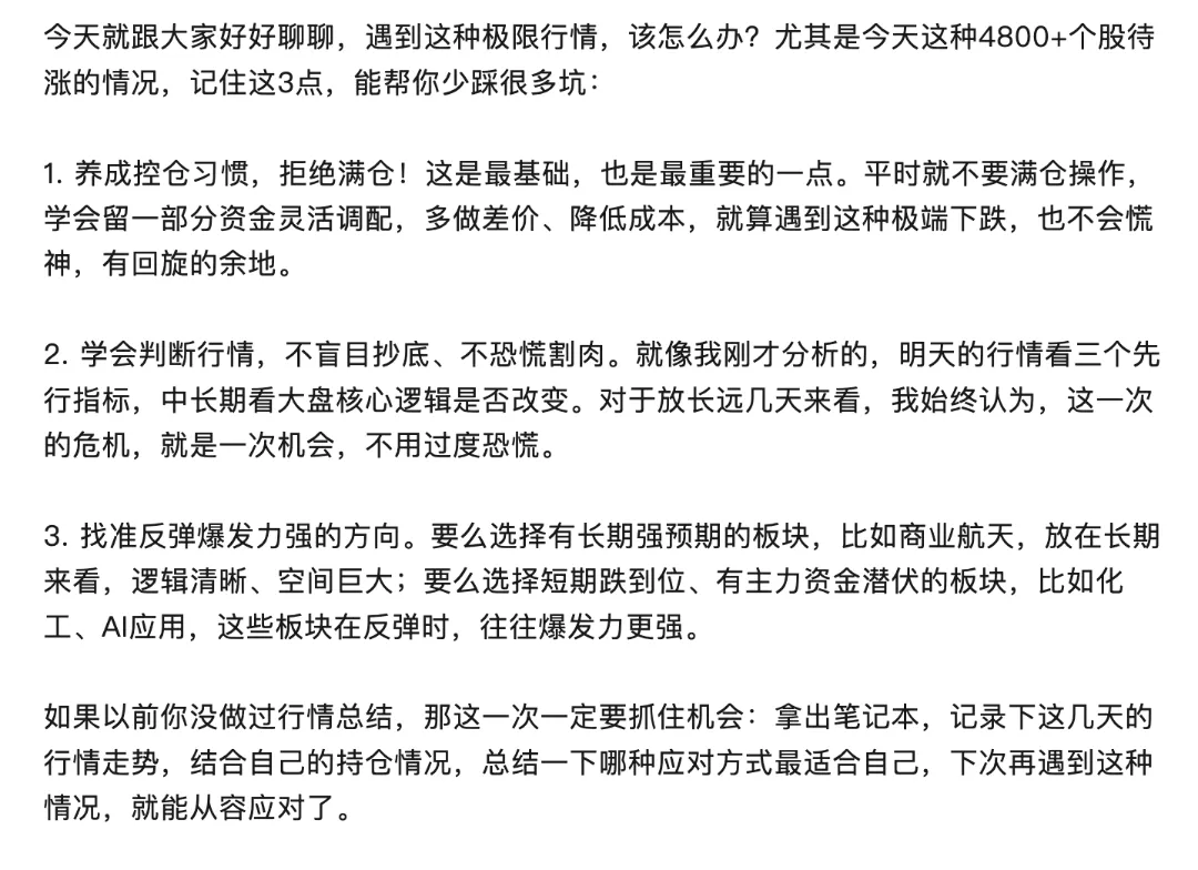 - 轮动行情别心急:本轮大概率是普涨反弹,手中低位滞涨标的不要盲目割肉,轮动行情下都会逐步补涨;唯独近期大涨过的高位标的除外,坚决规避高位接盘风险。