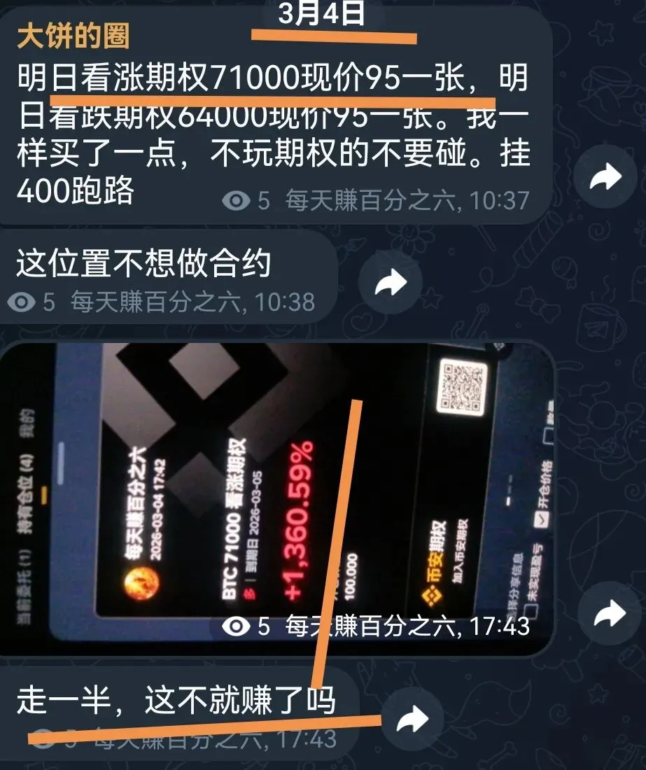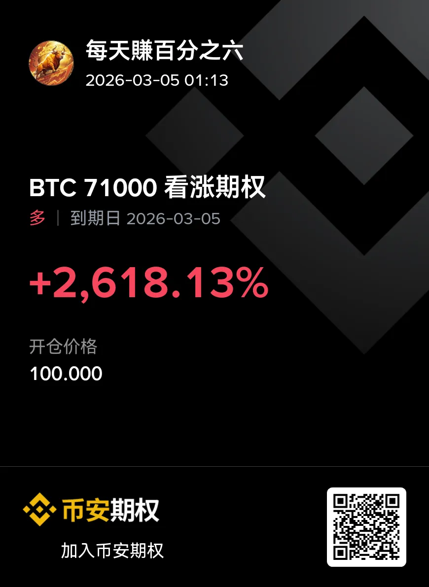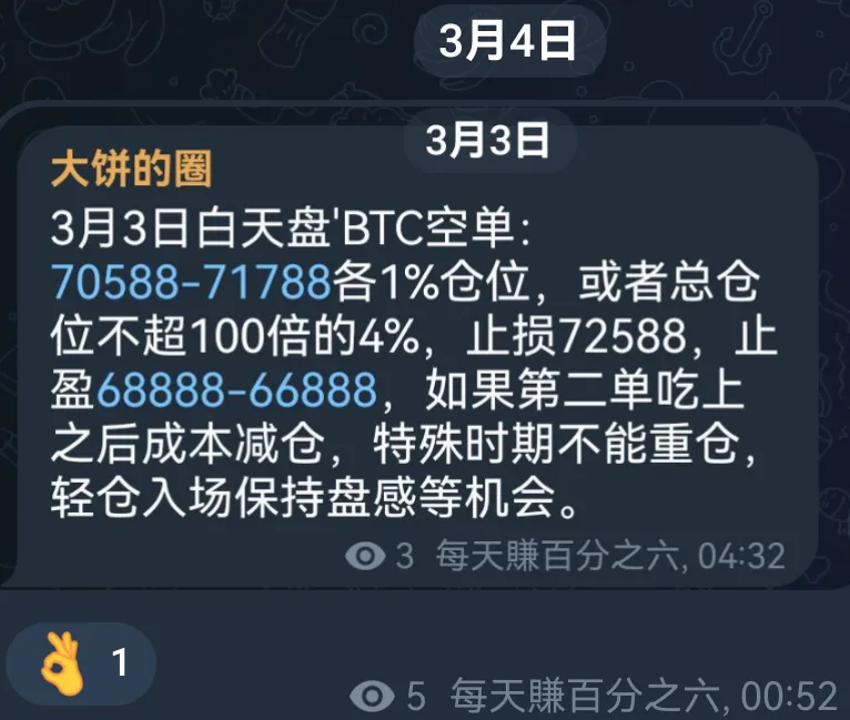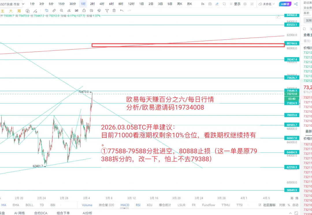 现在是2026.03.05凌晨0:08分,BTC在昨日中午(UTC-8)67350开启强势反弹,目前最高点为73500,涨幅9%+。合约方面我们70588-71788的空单在71188均价减仓后没有及时止盈,因美股开盘后的上涨行情在72588被止损,即使使用2%仓位,浮亏为账户金额的4%;昨日上午10点睡前安排的3月5日交割的71000看涨以及64000看跌两单对冲期权,由于行情大幅上涨的原因,看涨期权在傍晚醒来时价格已到1430,于1430止盈50%,晚间继续上涨至2100+再次止盈40%,目前今日看涨期权总落地利润为1900%,按照1%仓位计算今日期看涨权盈利为账户的19%减去看跌期权的亏损为18%。今日开单利润合计为账户的18-4=14%,不包括剩余的期权仓位价值(剩余看涨期权价值暂时为开单前账户的2.5%+,目前盈利2600%)。最近还在大A救市,精力有限,每日平均睡眠不到5小时,不要问为什么挂期权,问就是不想做合约,最近期权都赚大钱还在用怀疑的心态去观望,跟单不要带脑子,很容易观望时看着我一直在赚你跟进去就亏钱,然后再观望又看着赚钱,期权都是提前发出来的,今日的期权我进去后也是套了几个小时才盈利,患得患失的心态一定要磨掉。这几天利润有点高,需要休息几天,没有特别想进的单子就沉淀后再战。行情方面个人依旧看反弹非反转,已再次买入几日后的看跌期权,上方空单为主吧,合约多单低位时都不想做何况现在已经涨这么多了。等他形态出来,上方大空单继续挂着,赚钱的及时兑现或转入现货账户等机会,赚的多的把合约仓位调整下。说明一下:这里只分享BTC合约策略,需要更多实时单的朋友请关注主页,只需要使用返佣码,没有其他收费,免费试用一周目前依旧有效。2026.03.05BTC开单建议: