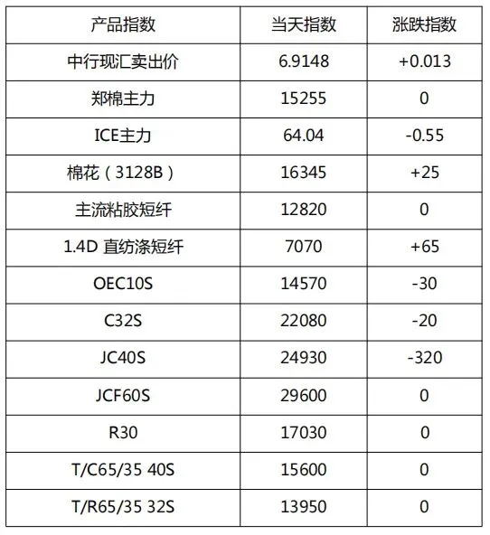 今日纯棉纱市场价格整体持稳、局部微调。近期部分纺企新订单陆续下达,市场交投氛围缓慢回暖;报价呈现分化:少数前期涨幅较大纺企报价有所下调,少数涨幅较小且近期成交偏畅纺企报价小幅上调。当前阶段纺企仍以执行前期订单为主,内地纺企开机率延续小幅回升态势。