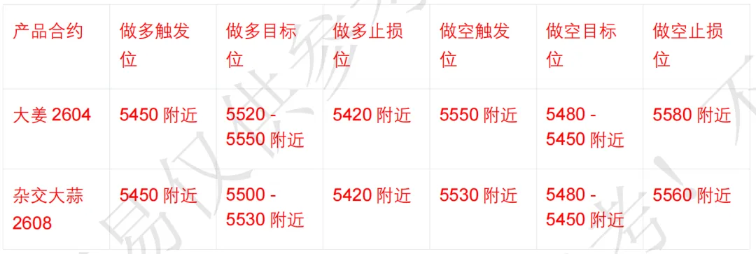 • 大姜 2604:今日大概率在 5400-5550 区间震荡,操作上以高抛低吸为主,重点关注 5450支撑位和 5550 压力位的突破情况。