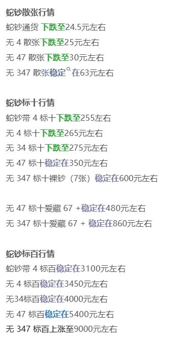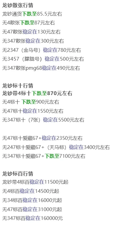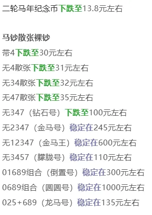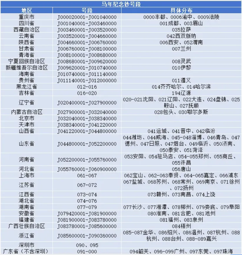 小龙钞:散钞板块仅带四散钞微涨1元,其余散钞规格持平;标十板块分化明显,无四七标十大涨150元,带四标十、无四标十则小幅下跌。蛇钞:整体小幅回调,带四标十下跌15元,无四标十、无三四标十均下调5元,其余规格价格不变。马钞:全规格微跌,标十各档位普遍下调5-10元,无三四七标十由区间价收窄至950元。最后提醒大家,马年币钞还有一次预约机会,按照惯例将在4月前后开启。届时22:00可预约马年币,22:30可预约马年钞,每人最多可预约20枚纪念币和10张纪念钞,有需要的藏友可以提前做好准备。全国各地的马钞号段分布基本确定了,大家可以根据上表看看自己所在地区的号段情况。