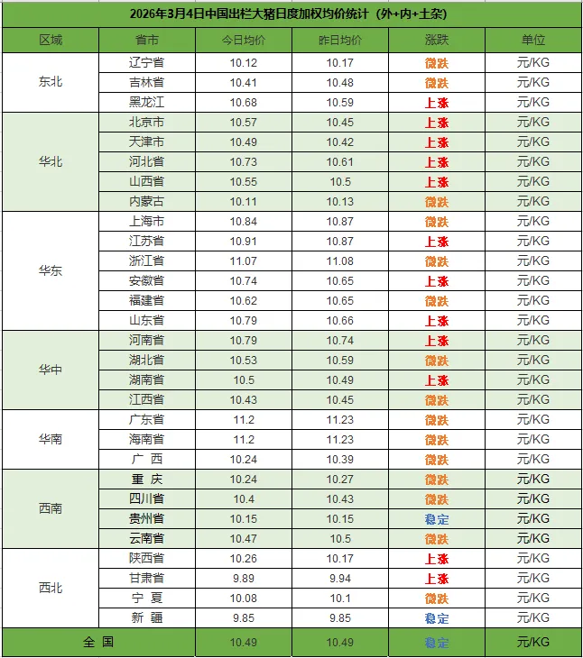 2026年3月4日,中国主流市场出栏外三元、内三元及土杂商品大猪加权日均价较昨日价格稳中有涨,全国生猪出栏加权日均价10.49每公斤,较昨日价格上涨0.03%。当前供应端偏宽松,前期压栏大猪、规模场出栏增加叠加冻品库存偏高,市场供给充足;需求端处于节后淡季,消费偏弱、屠企持续压价收购,养殖端亏损扩大。预计近期仍低位震荡。今日全国外三元、内三元及土杂猪均价如下:1) 主流市场外三元大猪全国销售均10.60元每公斤,较昨天价格下跌0.03%;2)主流市场内三元大猪全国销售均价10.23元每公斤,较昨天价格上涨0.28%;3)主流市场土杂大猪全国销售均价9.83元每公斤,较昨天价格下跌0.05%。
