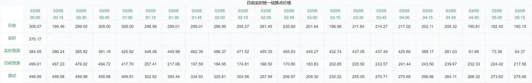 3月5日据官方数据统计,截止日前价格最低为40.00元/兆瓦时,最高为309.00元/兆瓦时。具体预测数据见下图: