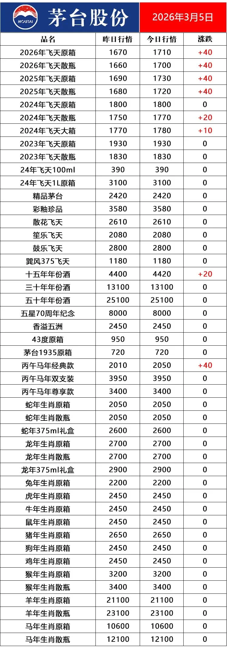 飞天价格上涨!3月5号酒价行情