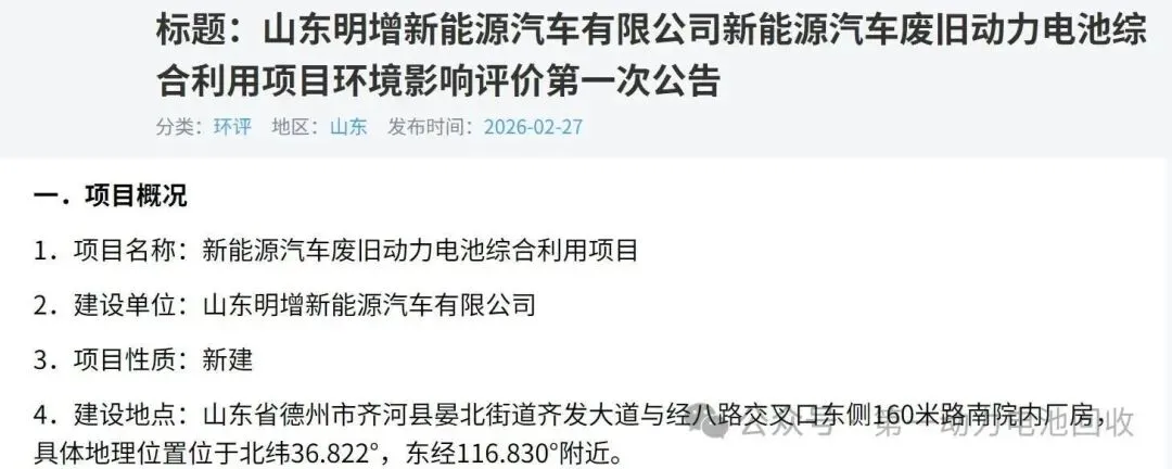 2月27日,相关网站发布了《山东明增新能源汽车有限公司新能源汽车废旧动力电池综合利用项目》环境影响评价第一次公告。根据公示信息,该项目选址于山东省德州市齐河县晏北街道,将利用现有厂房进行建设,规划购置撕碎机、风选器、破碎机、低温烘干炉、直线筛、磁选机、极片粉碎机、圆形摇摆筛、研磨机等主要生产设备。从工艺路线看,项目覆盖了撕碎、低温烘干、破碎、筛分、风选、研磨、磁选、比重分选等完整工序。这种以物理法为主的回收技术路径,具有能耗相对较低、二次污染风险较小的特点,是目前行业主流的预处理方式之一。项目建成后,将形成年处理1万吨废旧动力电池的综合能力。值得一提的是,这并非是德州市在电池回收领域的首次布局,早在2025年11月,德州德蕴投资发展有限公司的“运河经开区废旧动力电池拆解和规范化利用项目”就已进入环评报批前公示阶段。此外,清汇(山东)再生资源有限公司在德州的废弃资源综合利用项目也已于年初获得环评受理,规划年处理1.2万吨废旧锂离子电池和极片。根据《山东省汽车行业稳增长工作方案》,到2026年,山东省新能源汽车产量目标将达到120万辆左右,同比增长约20%。据不完全统计,山东省已建成及在建的锂电池回收项目超10个(含梯次利用、再生利用等类型),覆盖临沂、泰安、德州、淄博、济宁等主要城市,形成了“从回收网络到拆解再生”的全链条体系。注:本文来源于网络综合,不代表本网观点,如有侵权,请联系删除。