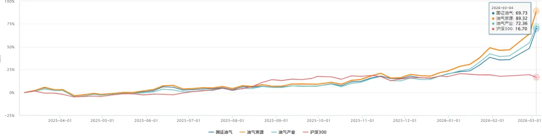 在“三桶油”持续强势的带动下,A股市场油气板块相关指数表现尤为突出。截至2026年3月4日,中证油气资源指数上涨89.32%、中证油气产业指数上涨72.36%、国证油气指数涨幅69.73,三个油气指数涨幅远超同期沪深300指数。
