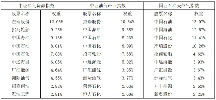 具体而言,中证油气资源指数成分股共44只,聚焦油气开采、设备制造、炼制加工、油气运输等核心上游环节,前十大权重股合计权重超67%,“三桶油”合计权重约25.02%,对国际油价波动的敏感度最强;中证油气产业指数包含60只成分股,覆盖油气开采、油服、运输、销售、炼化及初级化工产品生产,行业分布上兼顾上游弹性与中下游稳定性,攻守相对均衡;国证石油天然气指数成分股共50只,涵盖勘探开发、油气服务、燃气输配等领域,公用事业属性更强,防御性突出。
