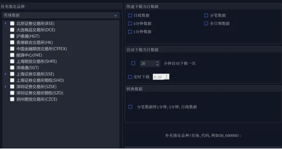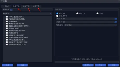 紧接着就可以开始下载行情数据了,有三种下载行情数据的方式:智能下载、快速下载、批量下载,我根据他们的区别重新来定义为:普通下载(智能)、定时下载(快速)、自定义下载(批量)。