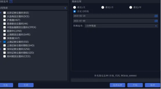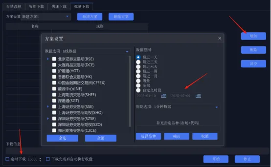 所谓自定义下载就是把前面两种下载方式结合起来并一次设定好方案,方便下次直接使用方案,比如我就下载上海交易所的数据或某几个股票的数据。