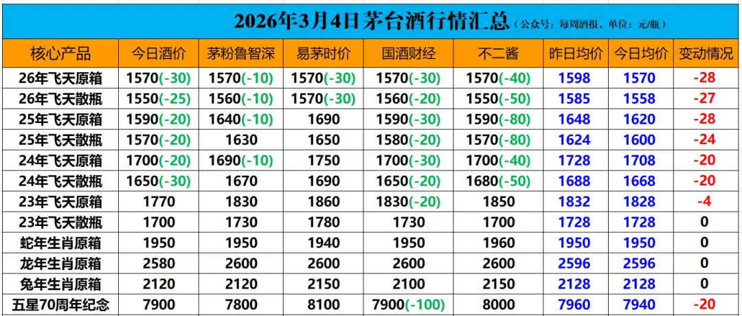 飞天茅台:2026年原箱均价大跌28元至1570元;散瓶均价下跌27元,报收1558元。2025年原箱大跌28元至1620元;散瓶下跌24元,至1600元。2024年原箱下跌20元至1708元,散瓶下跌20元至1668元。