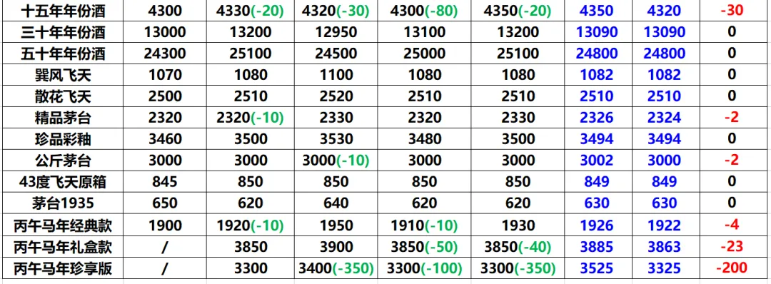 年份茅台:十五年年份酒下跌30元至4320元;三十年份茅台保持在13090元;五十年份酒维持在24800元价位。
