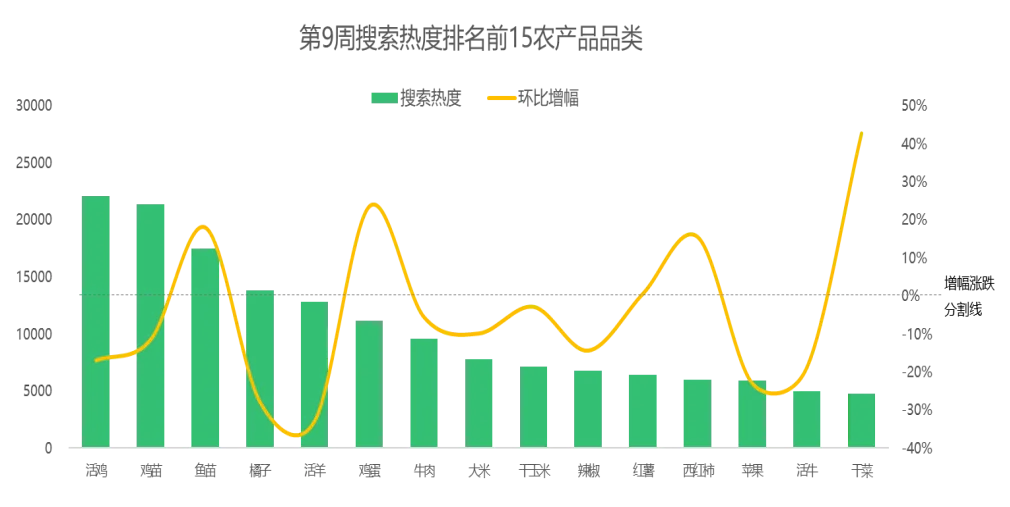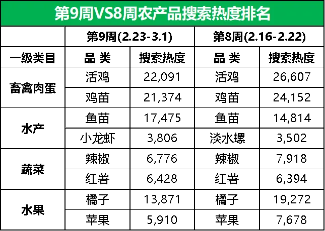 小龙虾登顶热度增幅榜,鸡蛋、西红柿和芒果价格同步下滑第9周,惠农网平台搜索热度排名前15的农产品主要分布在畜禽肉蛋(6)、蔬菜(3)、水果(2)、粮油米面(2)、农副加工(1)和水产(1)等6个大类,相较于第8周,蔬菜和农副加工下的品类数量均增加1个,水果下的品类数量减少2个。从环比增幅来看,第9周排名前15的农产品品类的市场关注度以跌为主。鱼苗、鸡蛋、红薯、西红柿和干菜等5个品类的搜索热度实现增长,活鸡、鸡苗、橘子、活羊和牛肉等10个品类的搜索热度有所下滑。具体细分到品类,干菜的市场关注度上涨较快,环比涨幅为43%;而市场关注度跌幅靠前的是活羊,较上周下跌33%。从排名来看,干菜、西红柿和干玉米的排名分别前移14位、4位和3位至第15名、第12名和第9名,鱼苗和红薯的排名均前移2位至第3名和第11名,鸡蛋和活牛的排名均前移1位至第6名和第14名;苹果的排名后移3位至第13名,橘子、活羊、牛肉和辣椒的排名均后移1位至第4名、第5名、第7名和第10名;活鸡、鸡苗和大米的排名与上周保持一致。据惠农网平台对畜禽肉蛋、水产、蔬菜和水果4大农产品类目的重点监测与追踪,第9周,畜禽肉蛋、蔬菜和水果排名前2位的品类与上周保持一致,仅水产的排名有所调整:鱼苗排名稳坐“冠军宝座”,小龙虾后来者居上,攀升至榜单亚军位。2.2 市场潜力搜索品类