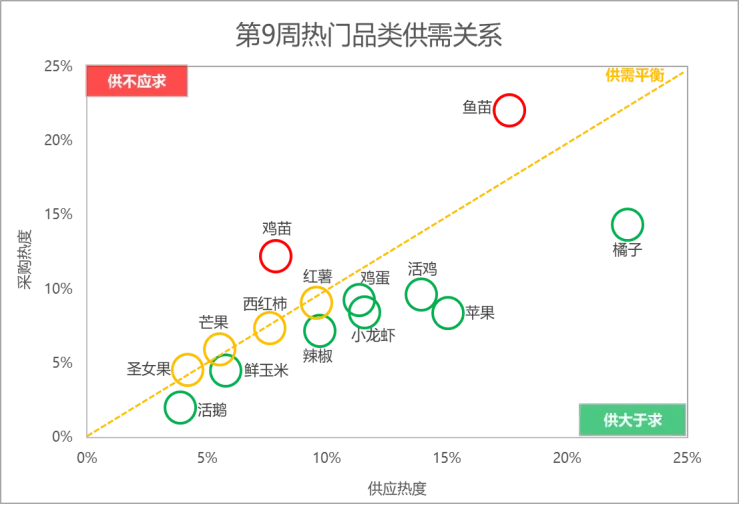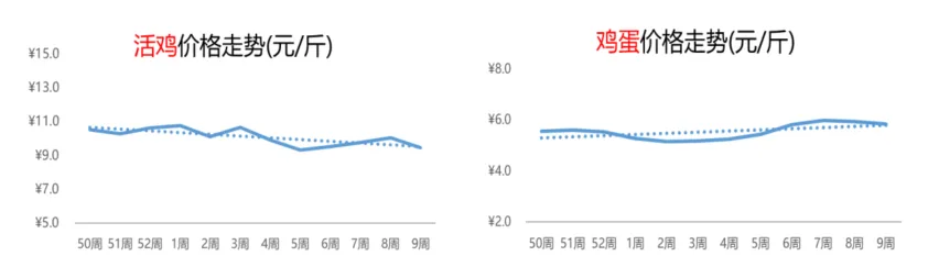 市场热门搜索品类的热度增幅方面,第9周,小龙虾的搜索热度增长最为强劲,较上周上涨49%,其次是芒果,搜索热度环比增幅为28%。分大类来看,畜禽肉蛋方面,鸡蛋领衔排行榜,活鹅次之;水产方面,小龙虾晋升至热度增幅榜第1名,鱼苗稳定在第2名;蔬菜方面,鲜玉米和西红柿热度增幅相差不大,分居首席和次席;水果方面,芒果市场表现较为亮眼,圣女果紧随其后。分析惠农网平台热门品类的供需关系:鱼苗和鸡苗的供应相对偏紧;圣女果、芒果、西红柿和红薯的供需相较平衡;活鹅、鲜玉米、辣椒和小龙虾等8个品类的供应相对充足。4.1 禽畜肉蛋:活鸡价格由涨入跌,鸡蛋行情延续下行